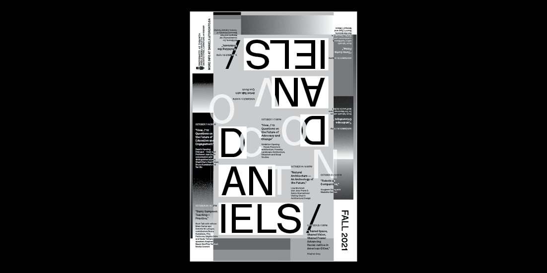 Posters and visual assets for Daniels Faculty of Architecture, Landscape, and Design at the University of Toronto between 2021 - 2022. Fall program poster and visual assets are grayscale, whereas winter poster and visual assets use vibrant colours. Winter 2022 posters were produced as Giclée digital prints.